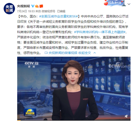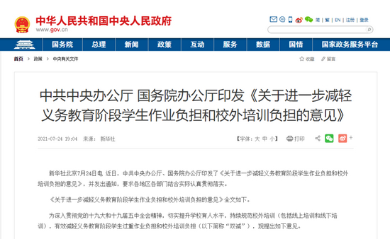 7月24日,中共中央办公厅、国务院办公厅印发了《关于进一步减轻义务教育阶段学生作业负担和校外培训负担的意见》(简称“双减”),并要求各地区各部门结合实际认真贯彻落实。