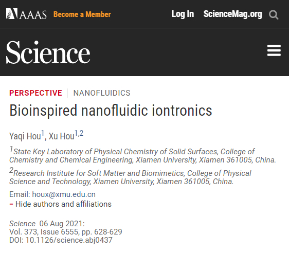 2021年8月6日,我校化学化工学院和物理科学与技术学院的双聘教授侯旭团队在美国《科学》杂志上受邀发表了关于新兴的仿生纳流离子学在未来人工智能、脑机接口技术中具有巨大潜能的Perspective文章。文章以“Bioinspired Nanofluidic Iontronics”为题,重点介绍了近年来纳流离子学的发展历程,提出了仿生科学将成为纳流离子学发展的新趋势,并展望了仿生纳流离子学在人工智能、脑机接口、类脑智能与人机增强等跨学科交叉领域的广阔应用前景。