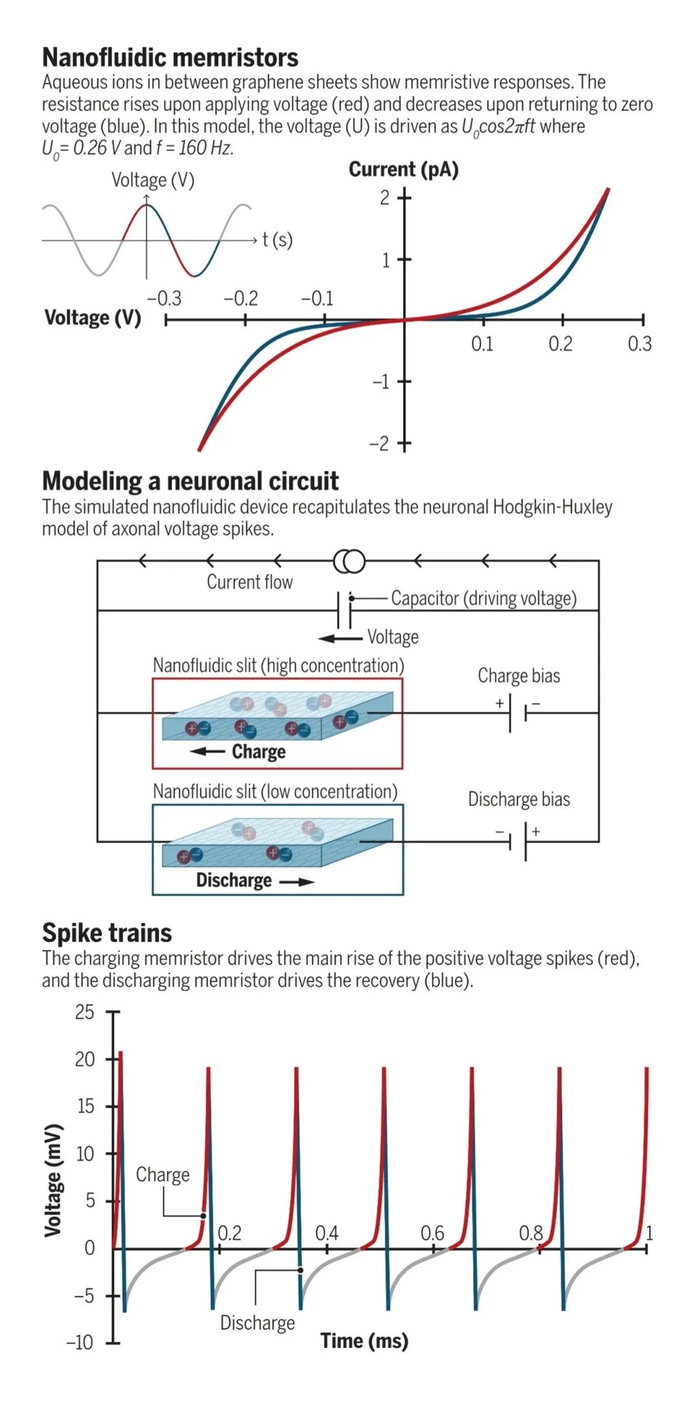 为了进一步探索这些生命过程中的物质传输机理,纳流控作为一门研究纳米限域空间中流体行为的新兴学科,逐渐成为科学界关注的前沿热点领域。借助纳流控技术和纳流器件模仿和实现生命活动中的各种离子传输现象也逐渐从想象变为现实。例如,基于二维平面纳流器件,Robin等人成功重现了类似于生物神经元产生的电压尖峰动作电位信号,展现了纳流离子器件在模仿生物神经系统行为中具有巨大潜力(如下图)。