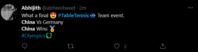 “多么精彩的一场(奥运)乒乓男团决赛。中国对阵德国。中国赢得金牌。”
