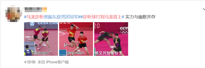 “许昕球打到马龙背上”这一话题也冲上微博热搜榜第二名。