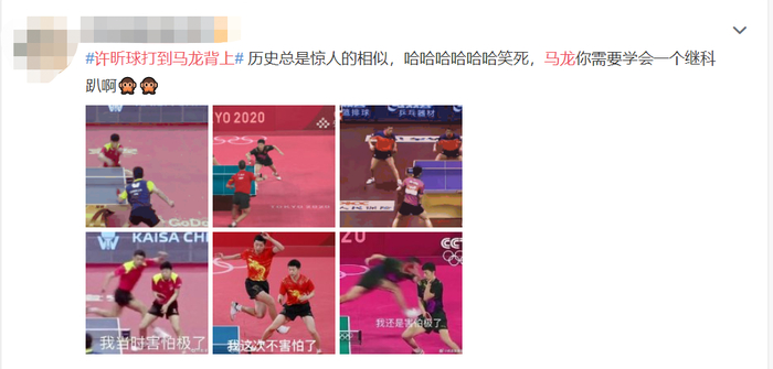 有网友翻出张继科此前打球趴地上的画面,笑称:“历史总是惊人相似,马龙应该学学张继科趴下。”↓