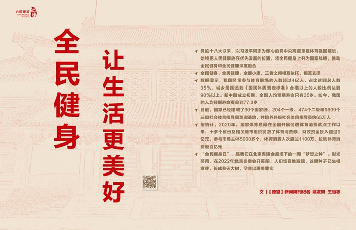“没有全民健康,就没有全面小康。要把人民健康放在优先发展的战略地位”。2016年8月19日,习近平总书记在全国卫生与健康大会上的这一重要讲话,为推进全民健身战略提供了方向性指导。同年10月25日,中共中央、国务院发布《“健康中国2030”规划纲要》,提出以人民健康为中心,为进一步推动“共建共享、全民健康”的健康中国战略主题规划了未来蓝图。