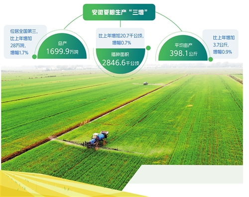 国家统计局最新公布的数据显示,今年安徽夏粮实现了面积、总产、单产“三增”。其中,夏粮总产达1699.9万吨,位居全国第三,比上年增加28万吨,增幅1.7%;播种面积2846.6千公顷,比上年增加20.7千公顷,增幅0.7%;平均亩产398.1公斤,比上年增加3.7公斤,增幅0.9%。