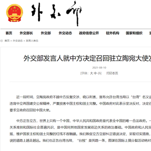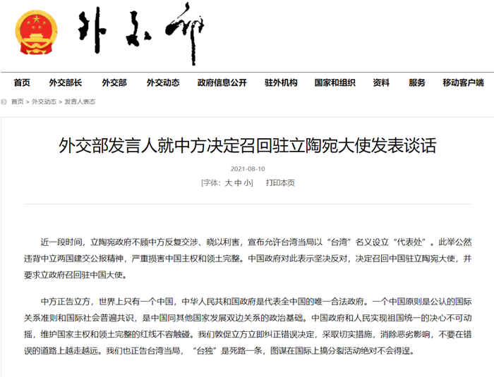 外交部刚刚宣布:中方决定召回驻立陶宛大使,并要求立政府召回驻中国大使