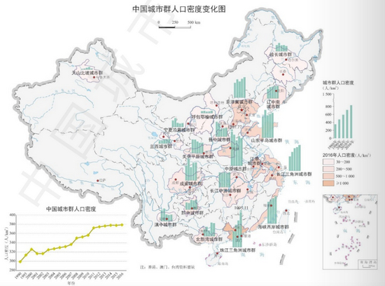 数据显示,2016年,中国城市群集聚的人口总量达10.39亿人、城镇人口5.71亿人,分别占全国总量的76.6%、72%;人口密度达378.98人/平方千米,是当年全国平均人口密度(144.1人/平方千米)的2.63倍。
