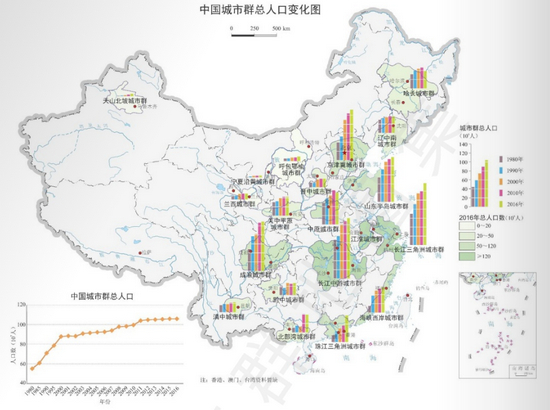 其中,长三角、珠三角城市群的人口总量及密度均增势明显;哈长、中原城市群不仅人口总量在2010~2016年出现明显减少趋势,2016年人口密度已跌出低于1980年的水平。