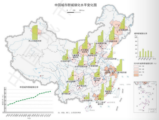 《中国城市群地图集》统计数据显示,在1980年到2016年的36年间,中国城市群城镇人口由0.96亿人大幅增长至5.71亿人,城镇化水平也从18.22%提高到54.92%(这里计算的城镇人口数据不包括城区和镇区的流动人口,因而计算结果低于同年全国城镇化水平值)。
