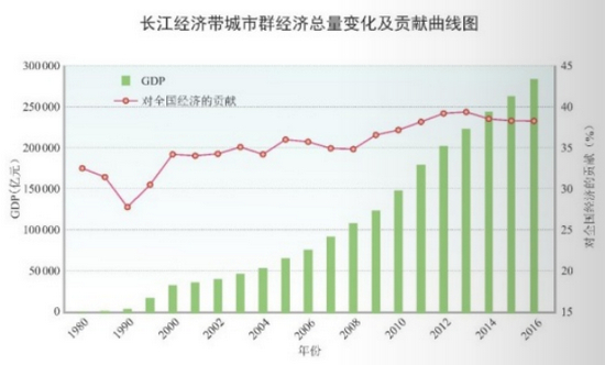 这些呈“1+2+3”梯度分布的长江经济带城市群,占据全国城市群总面积的35.5%。在1980~2016年间,总人口占全国比重由24.5%升至31.5%,GDP更是从0.14万亿元大幅拉升至28.45万亿元,2016年占全国城市群比重达47.8%。