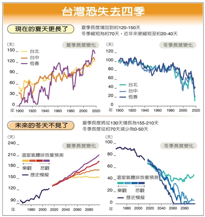 报道称,民众对“夏天愈来愈长、冬天愈来愈短”的感受也将愈来愈明显。台湾团队说,跟1990年前相比,台湾夏季长度已增为120天至150天,冬季减为70天,近年甚至剩下20天至40天。进一步推估未来到世纪末情况,台湾夏季甚至将大幅拉长为155天至210天,冬季降为0天至50天;且若在最惨情况下,可能在2060年就会完全没有冬季。