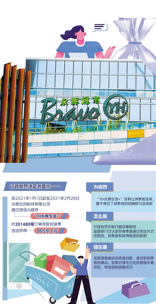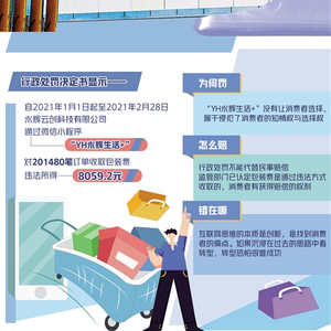 近日,永辉云创科技有限公司因在其运营维护的微信小程序“YH永辉生活+”中,未事先征得消费者同意,对每笔订单收取1元包装费,被上海市徐汇区市场监督管理局认定“强迫消费者购买商品或者接受服务”,没收违法所得8059.2元,罚款3.22368万元。