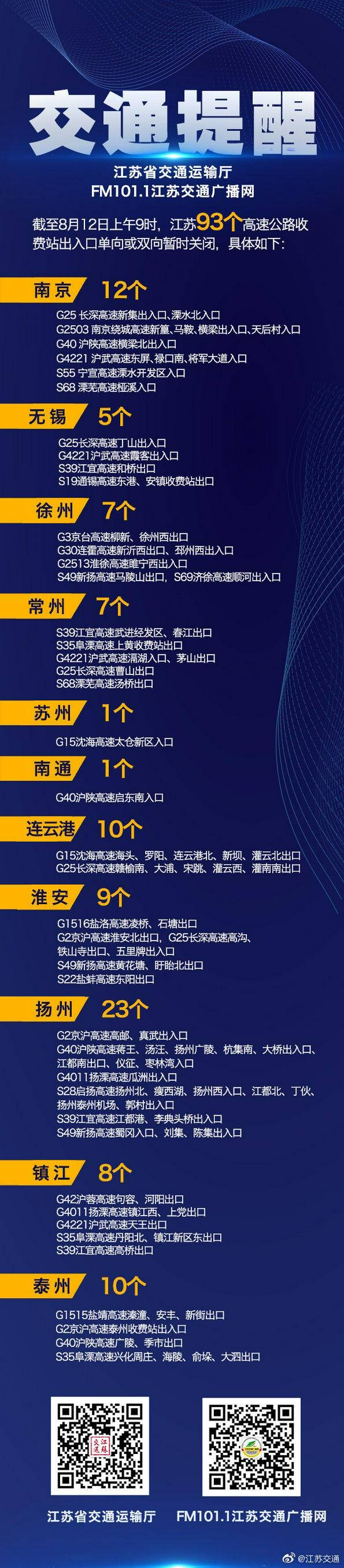 全省高速公路运行总体平稳。截至8月12日上午9时,南京、无锡、徐州、常州、苏州、南通、连云港、淮安、扬州、镇江、泰州等地区93个高速公路收费站出入口单向或双向暂时关闭,具体如下: