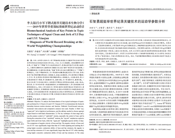 基于石智勇、吕小军等冠军运动员挺举、抓举动作特征,结合定点定焦摄像、三维运动学解析、力值传感等技术,宁大体育学院科研团队成功构建了73公斤级和81公斤级的举重冠军模型。该团队在中文体育学核心期刊《中国体育科技》《上海体育学院学报》,以及爱思唯尔出版社 (Elsevier) 旗下综合期刊《Heliyon》发表原创论文,其中英文论文一经发表即被遴选为当期封面论文,国际科技媒体Eurekalert!以“Want to be an elite weightlifter? It takes a strong pair of knees”为题对该文进行转载。
