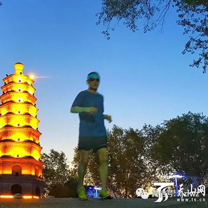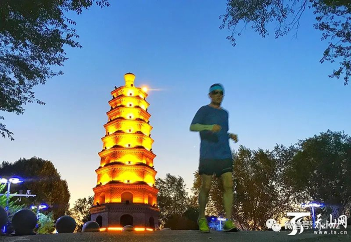8月12日早晨,乌鲁木齐碧空万里,在金光灿灿的雅山宝塔附近,一位早起的市民在跑步晨练。天山网-新疆日报记者张万德摄