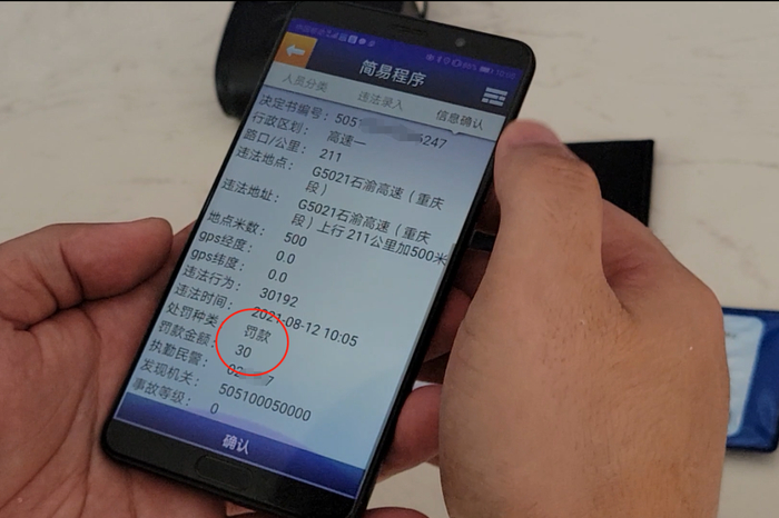 12日上午,G5021石渝高速(重庆段),一辆商务车因副驾驶位乘客未系安全带,被民警用“交巡执法通”录入并处罚 图:重庆交巡警