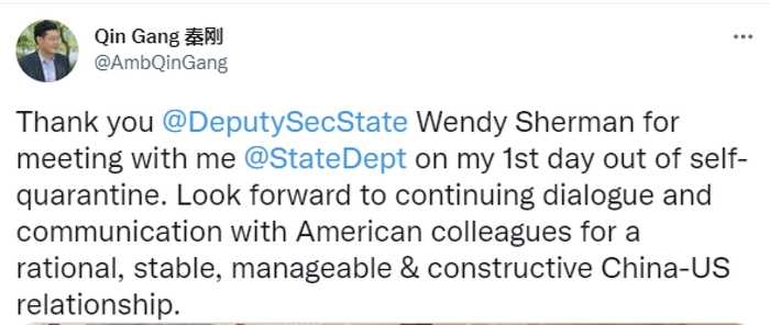 这是秦刚7月28日履新后,首次与美国国务院高级别官员会面。