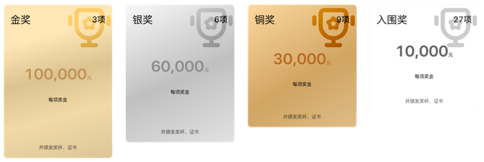金奖3项(每赛区1项)奖金每项10万元、奖杯、证书