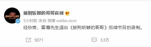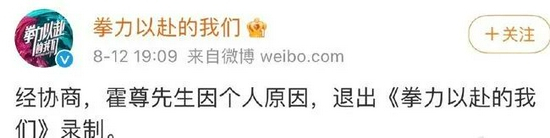 随后,12日傍晚,《披荆斩棘的哥哥》节目官微立即发布声明,称:“经协商,霍尊先生退出《披荆斩棘的哥哥》后续节目的录制。”