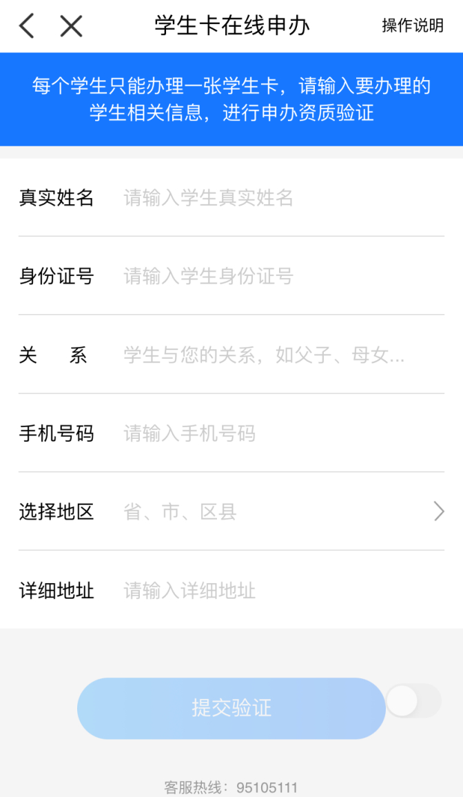 想知道更多关于学生卡在线办理的操作信息,可查看页面中右上角的“操作说明”。