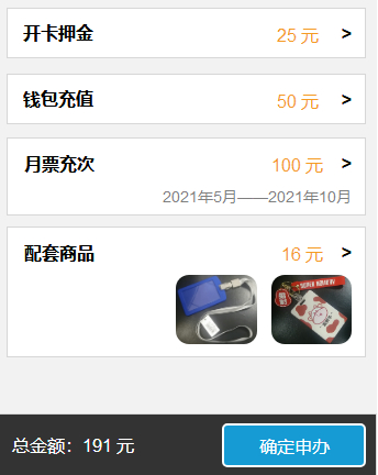 ④资料审核完成后,可选择钱包充值、月票充次及卡套等配套商品一次性选购服务(注:钱包充值和月票充值只需任选其一)。