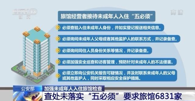 每年暑期,也是未成年人入住旅馆的高峰期,为切实加强对未成年人的安全保护,公安部5月底制定发布了旅馆经营者接待未成年人入住必须查验身份、询问未成年人父母联系方式等“五必须”要求,目前,已查处未落实要求旅馆6831家。