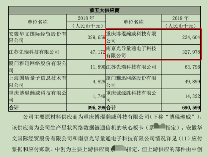 2019年,中创为的主要供应商是重庆博琨瀚威科技有限公司(下称“重庆博琨”),采购金额至少达到5.62亿元。重庆博琨亦是多家暴露“专网通信”风险的A股上市公司主要供应商,种种迹象显示,该公司为隋田力方面指定的供应商,其原材料主要来源于上海星地通。