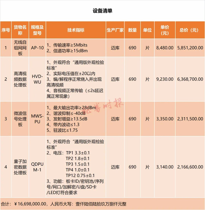 量子加密数据处理板每片3140元,其中是否真的含有量子技术?证券时报记者咨询了量子通信业内人士,得到的回复是:名称和描述都太通用,看着像是一块加密板卡,技术指标要求中没有加密性能、量子随机数率等专业指标,只有电压指标,应该本身不是量子技术设备,可能只是一个对接量子技术设备(量子随机数、量子密钥分发产品)的通用设备。