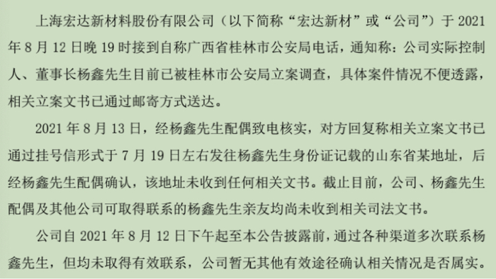 8月13日,宏达新材公告称,公司实际控制人、董事长杨鑫“疑似失联”。公司于8月12日晚19时接到桂林市公安局电话,公司实际控制人、董事长杨鑫已被该局立案调查。宏达新材与桂林坤弘有关联关系,宏达新材的控股股东上海鸿孜企业发展有限公司,也是桂林坤弘持股30%的股东。