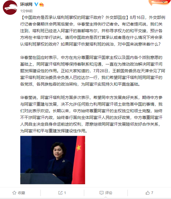 华春莹在回应时表示,中方在充分尊重阿富汗国家主权以及国内各个派别意愿的基础上,同阿富汗塔利班等保持着联系和沟通,一直在为推动政治解决阿富汗问题发挥建设性的作用。正如大家知道的,7月28日,王毅国务委员在天津会见了阿富汗塔利班政治委员会负责人巴拉达尔一行,我们希望阿富汗塔利班同阿富汗的各党派、各民族包容的政治架构,为阿富汗实现持久和平奠定基础。
