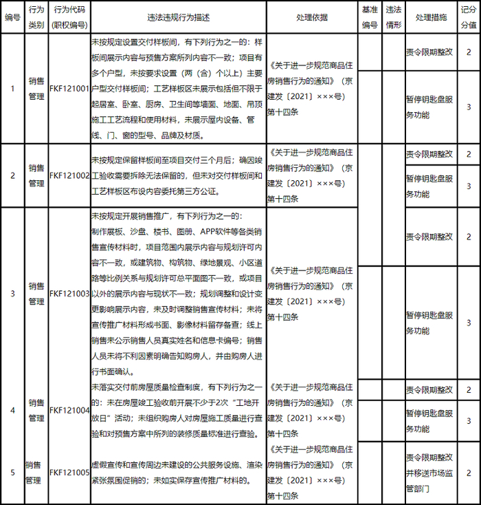 (十四)违反本通知规定的,由市、区住房城乡建设主管部门责令开发企业限期整改,并按《北京市房地产开发企业资质动态监督管理暂行办法》规定进行记分(记分标准见附件)。整改期间,由市、区住房城乡建设主管部门暂停网签钥匙盘服务功能。涉嫌虚假广告的,移转相关部门进行处理。