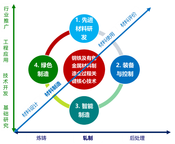 在制造维度,考虑流程工业的特点,以轧制作为核心工序环节,向上游炼/熔铸、下游后处理工序延伸,实现全流程的协同;在产品寿命维度,以制造过程(重点是轧制过程)为核心,向上游材料设计、下游材料使用及评价延伸,实现产品全生命周期的协同;在方法维度,通过基础研究、技术开发、工程应用和行业推广,确保研究成果取得实效,真正实现先进钢铁及有色金属材料及其制造关键核心技术的自主可控,不断提升钢铁及有色金属产业的现代化水平,为我国钢铁及有色金属工业由大变强做出新的贡献。