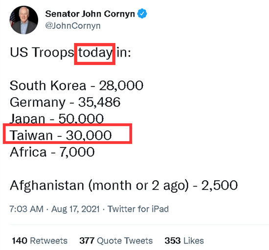 昨天,美国国会参议院的资深共和党参议员、参议院情报委员会的重要成员约翰·科尼,发布了一则宣称台湾“如今”有3万美国驻军的贴文。考虑到他在美国政坛的身份地位、以及他一直在推动美国和台湾军事合作的一系列举动,这则网贴立刻引起了中国媒体和网民的强烈关注,纷纷要求美国方面回应此事,或让大陆方面去台湾调查此事。