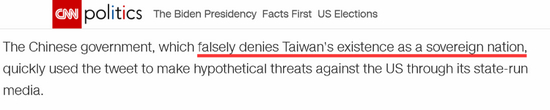 我们都知道,根据中美三个联合公报,以及联合国的相关决议,台湾从来都是中国的一部分,而不是一个所谓的“主权国家”。CNN将其描述成“主权国家”的做法才是错误的。