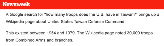 根据该刊的说法,宣称美国“如今”在台湾有3万驻军的约翰·科尼,可能是“误用”了维基百科上给出的一个说美国在1954年到1979年间有3万士兵驻扎台湾的数据。