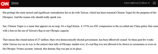 可作为美国最主流的大新闻媒体,CNN却如此颠倒黑白——甚至于前不久的奥运会期间,CNN还在其一期节目中公然对国际奥委会要求台湾以“中国台北”参赛表达不满,想让奥委会允许台湾使用台湾所谓的“国旗”和“国歌”呢。