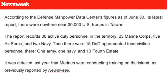 但值得注意的是,《新闻周刊》补充说,根据美国国防部6月30日的数据,台湾是有美军现役人员的,这些美军现役人员的人数在30来人左右,其中包括23名海军陆战队人员,5名空军人员,2名海军人员。另外,台湾还有15名受雇佣美国国防部的平民。