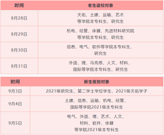 第一批返校学生为有中高风险区的省(市、区)的低风险地区学生,于8月26日返校报到。第二批返校学生为除第一批之外的省外低风险地区的学生,于8月27日报到。第三批返校学生为省内低风险地区学生,含返校前14天内均身处四川省的学生,于8月28、29日报到。新生9月4日报到。
