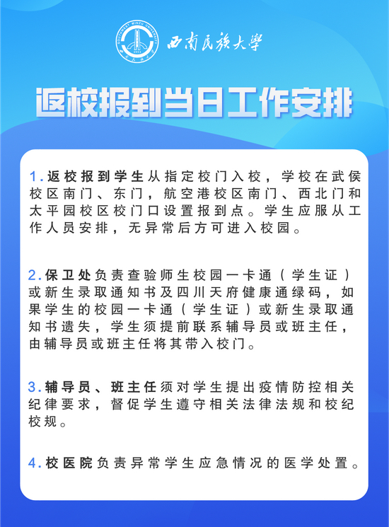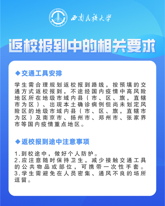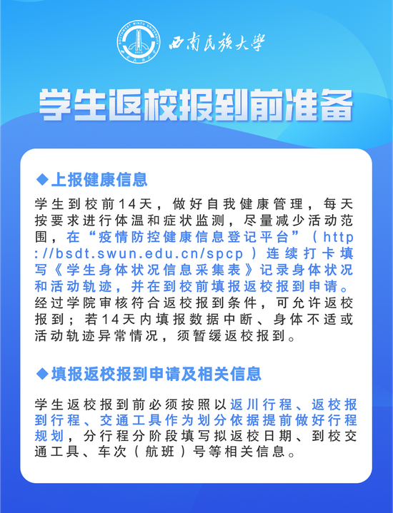 根据上级部门和属地新冠肺炎疫情防控相关工作要求,结合学校疫情防控工作实际,现将西南民族大学2021年秋季学期教职工、学生返校和新生报到相关工作通知如下: