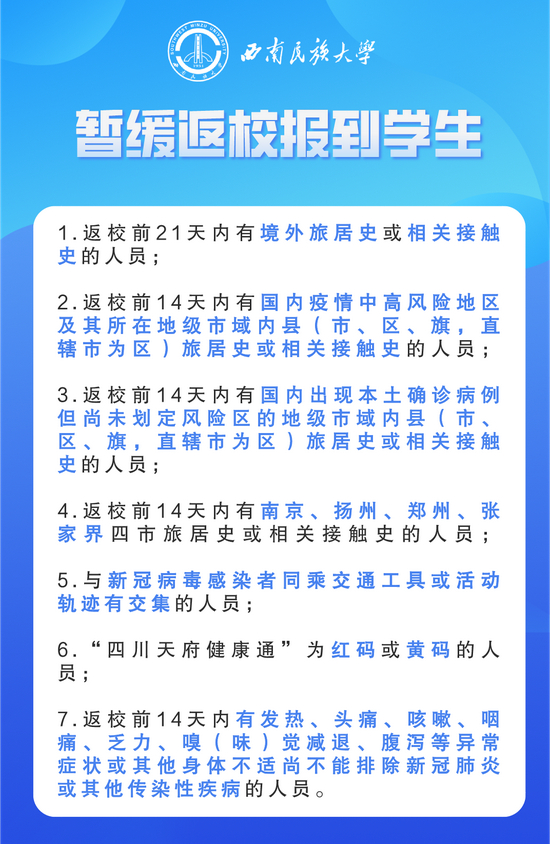 近14天内有中高风险地区旅居史或“四川天府健康通”黄码、红码的学生暂不返川返校。近14天内有本土确诊病例报告但暂未划定中高风险地区的学生,未返校的暂缓返校;已返校的应立即再次进行核酸检测,检测结果为阴性的纳入社区管理至离开疫情发生地14天为止。返校前一周有发热、干咳、乏力、咽痛、嗅(味)觉减退、腹泻等症状的学生及时向学校报告,治愈后返校。所在地风险解除后,须持登机登车前48小时内核酸阴性证明和“四川天府健康通”绿码返(川)入校,到校后第一时间再次进行核酸检测。