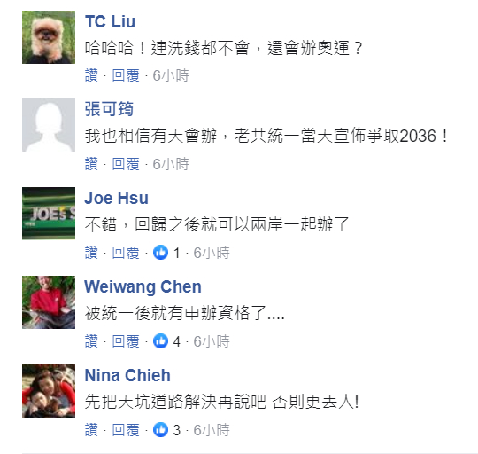 对于这一消息,有不少台湾网民都在评论区调侃民进党政客“不自量力”,有的人建议台当局先搞好民生工程而不是忙着抛类似的噱头作秀,也有人开玩笑说,等到2036年可能台湾已经回归了,那时可以两岸“一起举办奥运”。