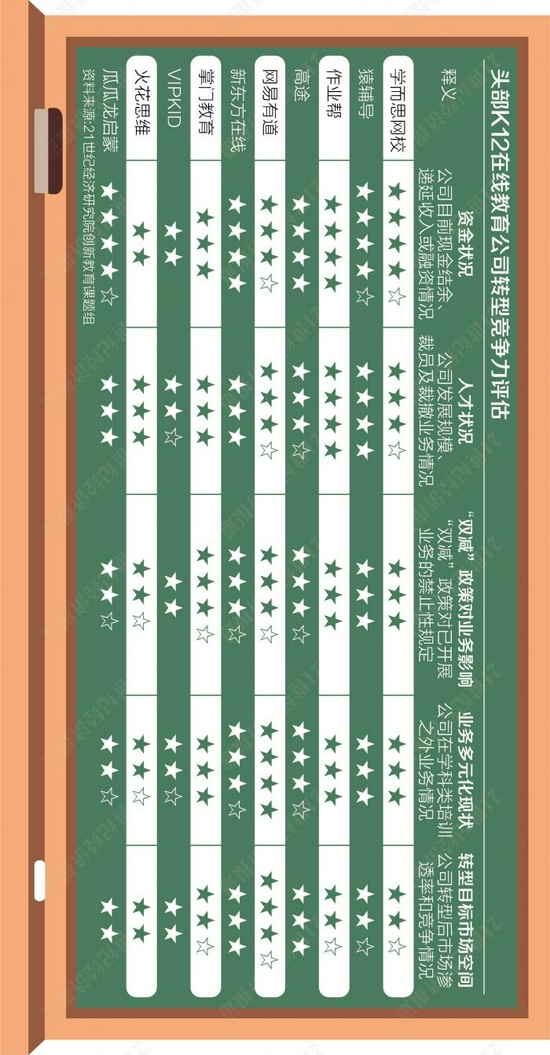 转型竞争力,是对K12在线教育公司目前采取的教学模式,储备的人力、资金等资源,“双减”政策出台前商业模型的验证情况,转型后新业务的市场空间等综合因素进行考量后的结果。“双减”对在线教育的不同教学模式影响不一,采取同一教学模式的不同公司的转型竞争力也有强有弱。