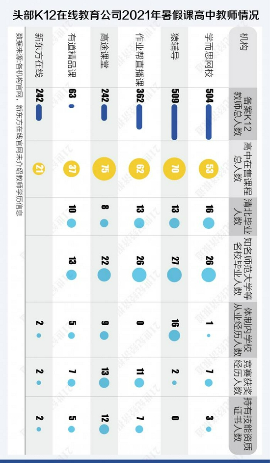 名师化是头部公司高中课程的普遍特点,但不同公司的教师策略也有不同。学而思和新东方是国内校外培训行业的“黄埔军校”,多年来源源不断地对外输送人才,但其强大的品牌号召力和师训能力能够保证人才供给。学而思网校和新东方在线的高中教师大多数来自体系内部,其中主要来自线下学校。学而思网校注重年轻人才培养,每年大量招收清华、北大优秀毕业生,其清北毕业的高中教师人数最多。