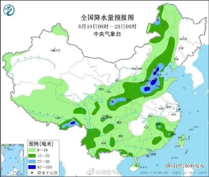 据河南省气象部门预报,8月19日下午到夜间,淮河以北大部有阵雨、雷阵雨,安阳、鹤壁、新乡、濮阳、三门峡、洛阳等县市有中到大雨、局部暴雨(25~45毫米、局部70~100毫米),局地伴有7-8级短时大风;郑州市有中到大雨伴有雷电,局部有暴雨。