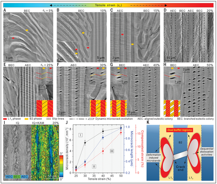 目前,该团队在一种新型的共晶高熵合金材料中颠覆了这一观念:采用独特的凝固组织控制手段,将共晶高熵合金中的共晶层片结构设计成类似鱼骨的多级共晶层片结构,在拉伸变形时,超硬相B2相中不但形成位错和晶界滑移,还将萌生高密度微裂纹,缓解材料变形时的应力集中;且该微裂纹仅在B2相中大量萌生和沿拉伸方向拉长,微裂纹遇到软性相L12相界时不再扩展,裂纹前端钝化为圆形;而在软性相L12相中形成大量的高密度位错和晶界滑移,形成不断累积的加工硬化,表现出超优的塑性变形能力;B2和L12两相的这种协同变形作用下,B2相中大量萌生的微裂纹不仅不会恶化共晶高熵合金性能反而可以做为一种有效的应变补偿去改善材料塑性。