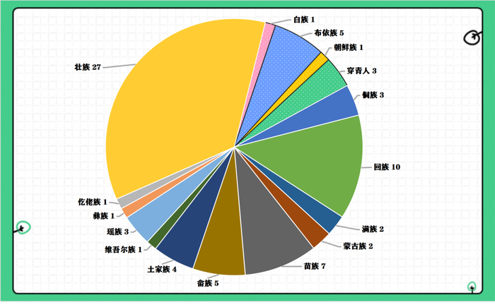 新同学分别来自17个民族,包括汉族、回族、壮族、苗族、畲族等。除汉族的2862人外,其他少数民族人数分布如下图所示。