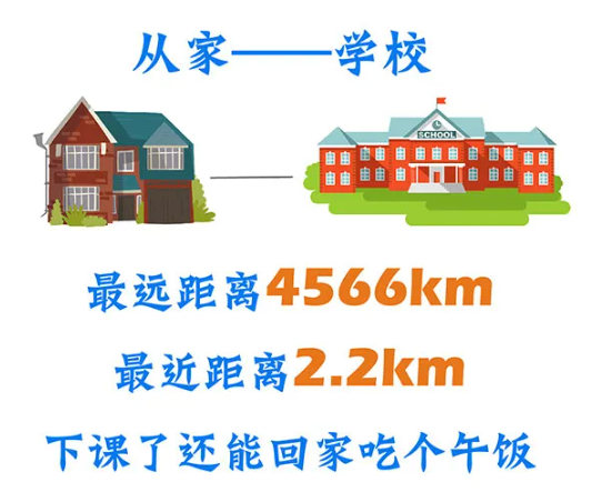 距离最远,4566km;距离最近:2.2km,下课还能回家吃个饭。