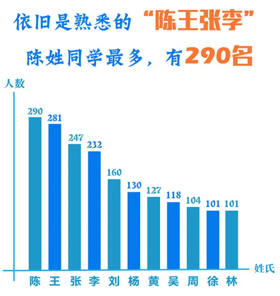 新生中总共有300个姓氏,“王”姓的新生最多,有291人。另外,新生中有89个姓氏是独一无二的。