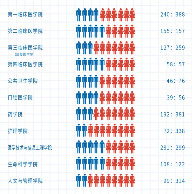 从学院来看,录取新生最多的学院是第一临床医学院,人数最少的是口腔医学院;男女生人数最均衡的是第二临床医学院(接近1:1),男生最多的是医学技术与信息工程学院,女生最多的是第一临床医学院。