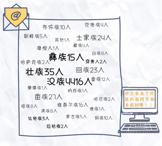 新生中,汉族人数最多,有4209人,有16个少数民族,其中占比最大的是壮族。