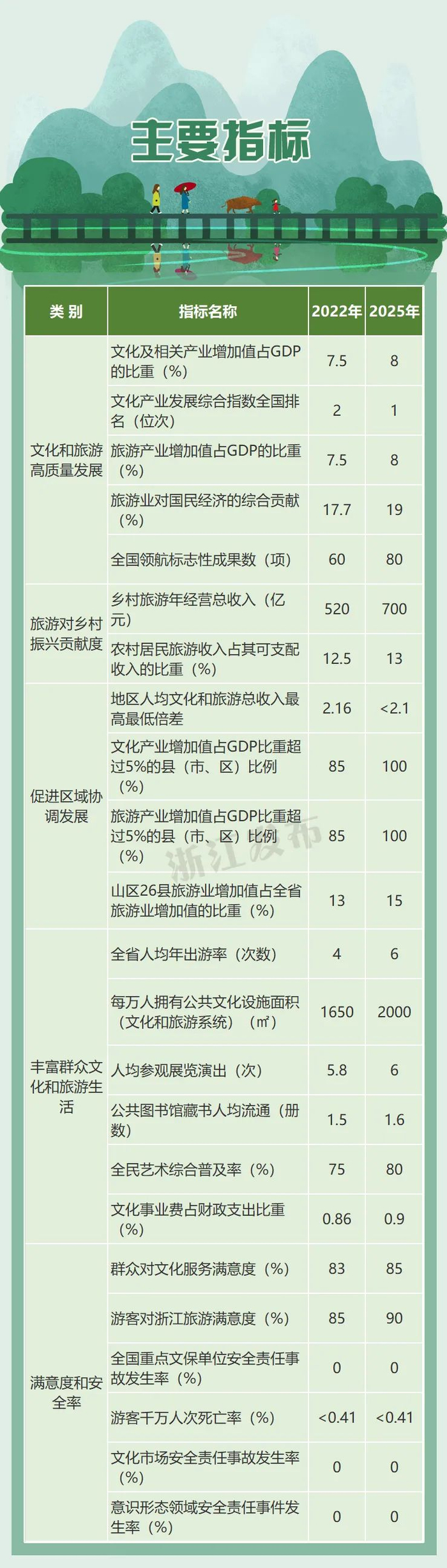 先行探索共同富裕现代化基本单元建设,全省各县(市、区)文化和旅游产业增加值占GDP比重均不低于5%……浙江要抓重点补短板促提升,努力成为文化和旅游城乡区域协调发展的省域范例。